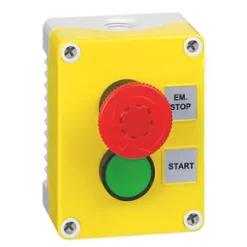 Push button control station with red mushroom head and key reset. Includes 1 normally open and 1 normally closed contact block, 2 x M20 threaded and 1 x M20 non-threaded cable entry knockouts.