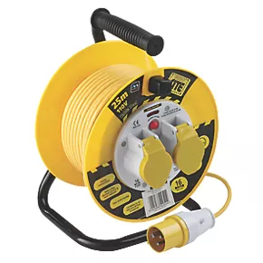Cable reel with 2 x 16A 2P+E sockets and 25m cable. Ideal for use on site or in the workshop.